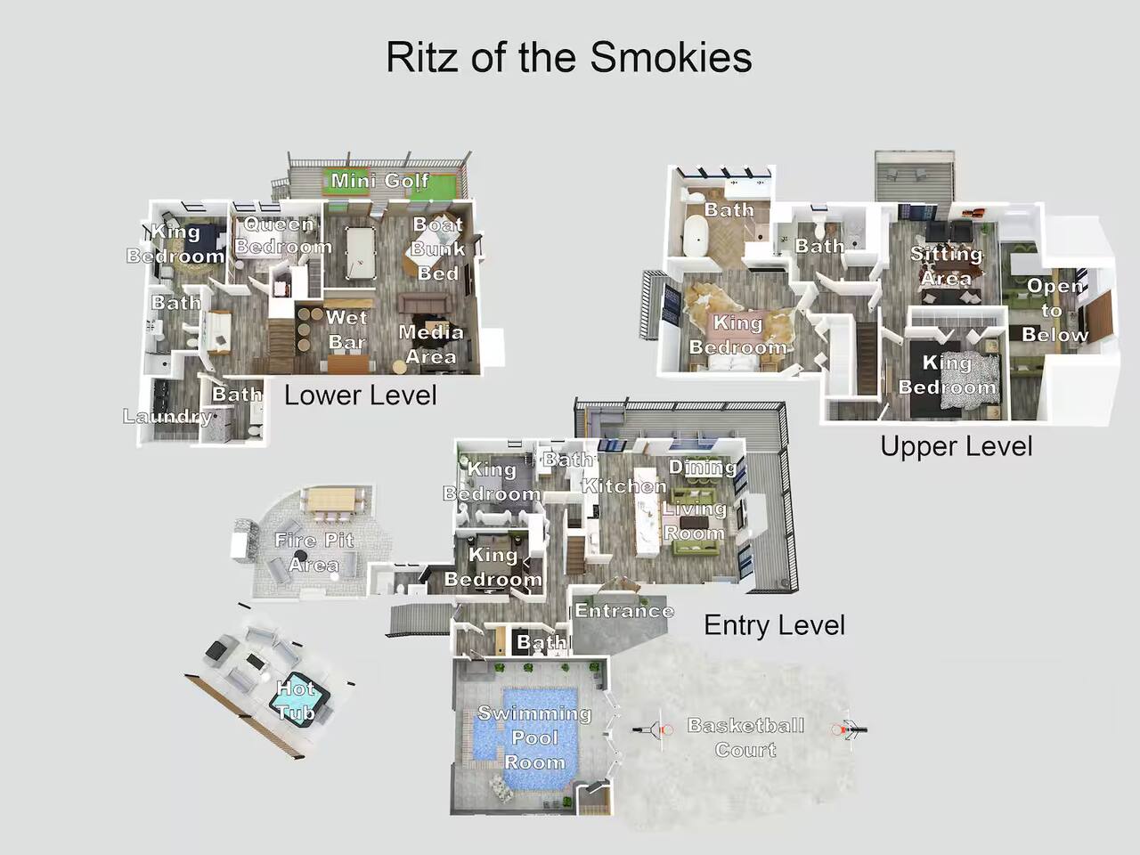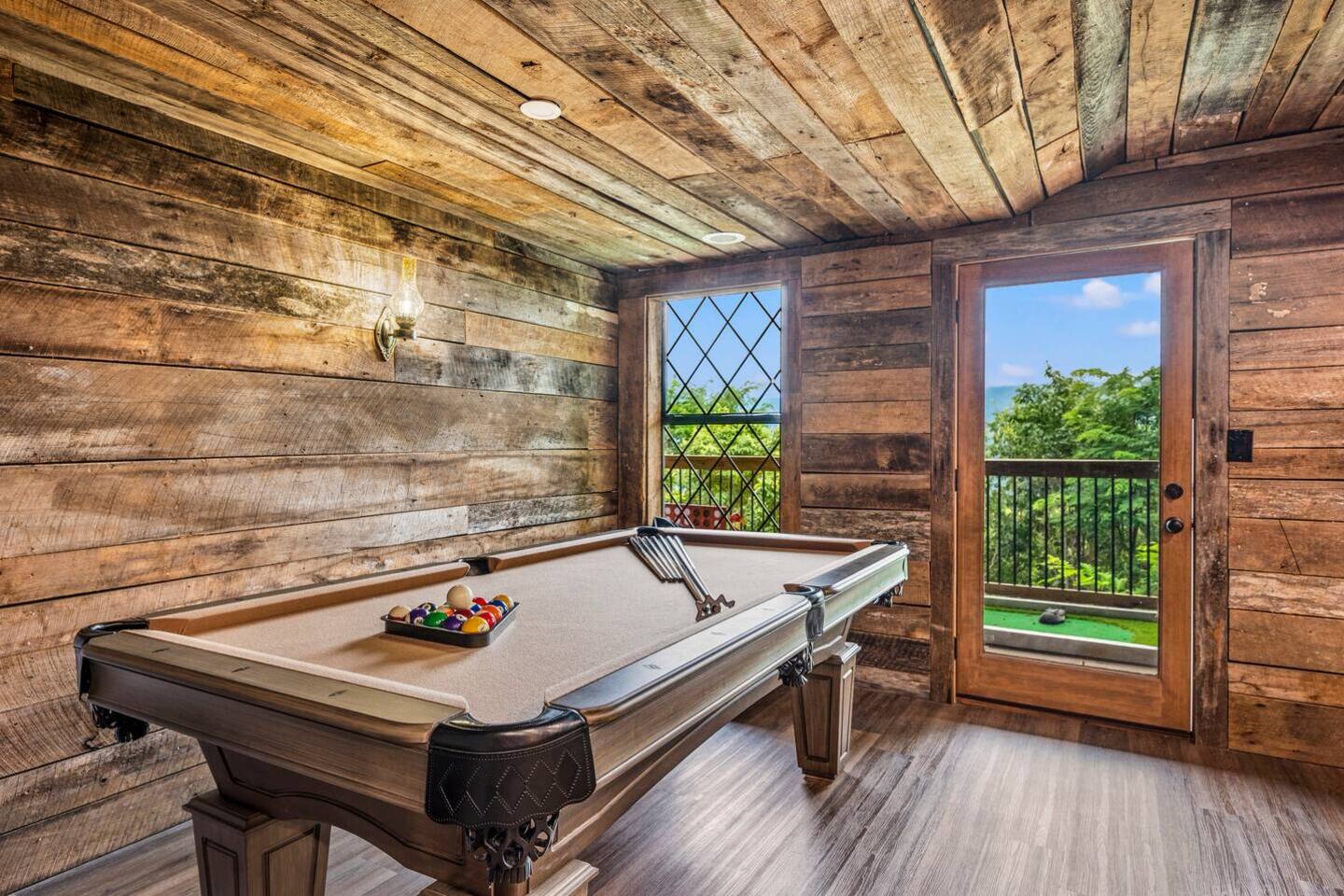 Looking for all the amenities you could dream of and more? You'll find them here! Enjoy your private basketball court, pickleball, and putt putt. Unwind in hammocks, the hot tub, or outdoor seating. Inside, walk on the moon with the VR headset, watch movies in the theater room, shoot pool, and more. Plus, a private indoor pool with a swim-up bar—all with a spectacular mountain view!
