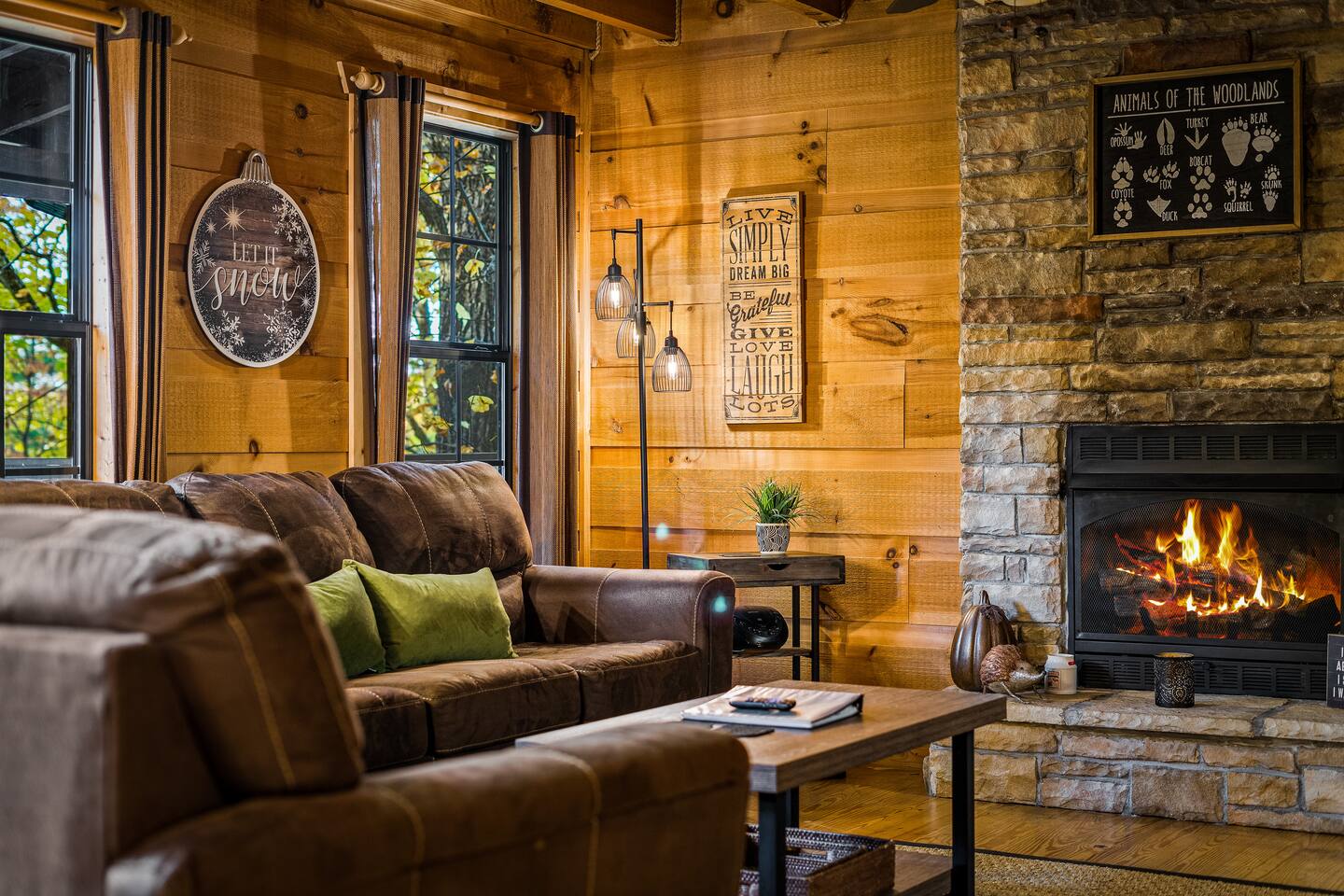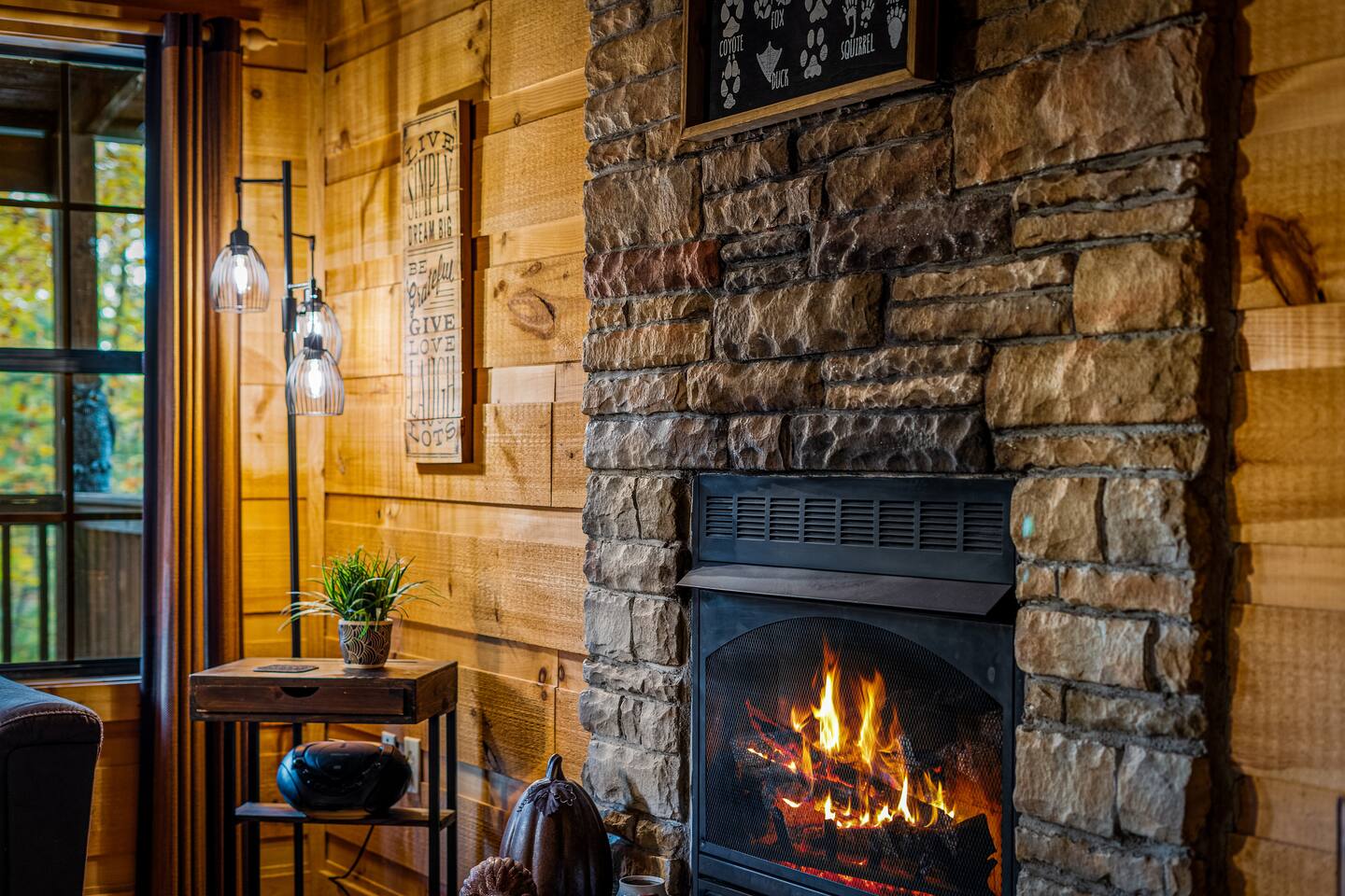 4. Living Room: Stone Fireplace + Smart TV + Comfortable Seating