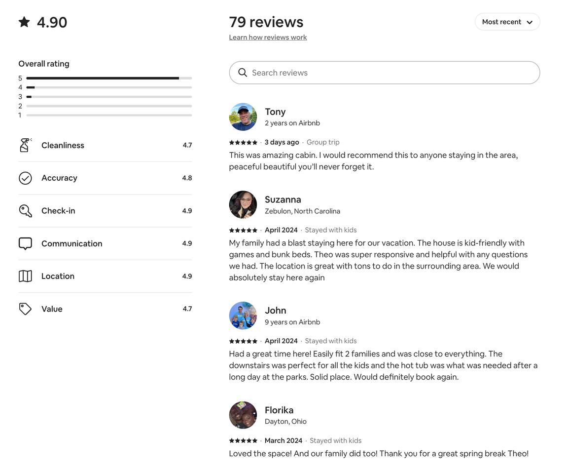 Host seems like a nice guy, and check-in went smoothly, but the house really needs a deep clean. There was enough sleeping room for 7 adults and 6 kids, but we ran out of clean towels and there were no extra. There were no bathmats outside the shower in a couple of the bathrooms, and the sliding shower door kept coming off the track in one room, making it nearly impossible to open and close the shower door. We also ran out of toilet paper, and when we tried to cook breakfast one morning there were no measuring cups. There's a nice deck, but there were only two chairs and two rocking chairs out there, so the adults couldn't all hang out out there at the same time which would have been nice. Also, there's a steep and narrow spiral staircase between floors, so keep that in mind if you have any mobility issues.