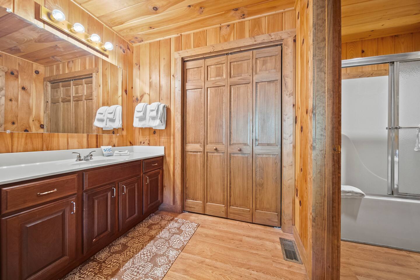 The photos accurately depict the cabin, which comfortably accommodates 14 guests. Parking instructions were unclear initially, requiring me to seek guidance for additional vehicles. The beds, though serviceable, could benefit from replacement due to noticeable wear. There was a shortage of extra blankets and pillows. Bringing your own toiletries was expected, but we found only one trash bag and no hand soap in the kitchen. Bar soap and hotel-sized toiletries were provided. We noticed mold in the vents before checkout; while I assume replacements were made, it's advisable to confirm before booking. Apart from these points, we encountered no other issues. Theo was a friendly host.